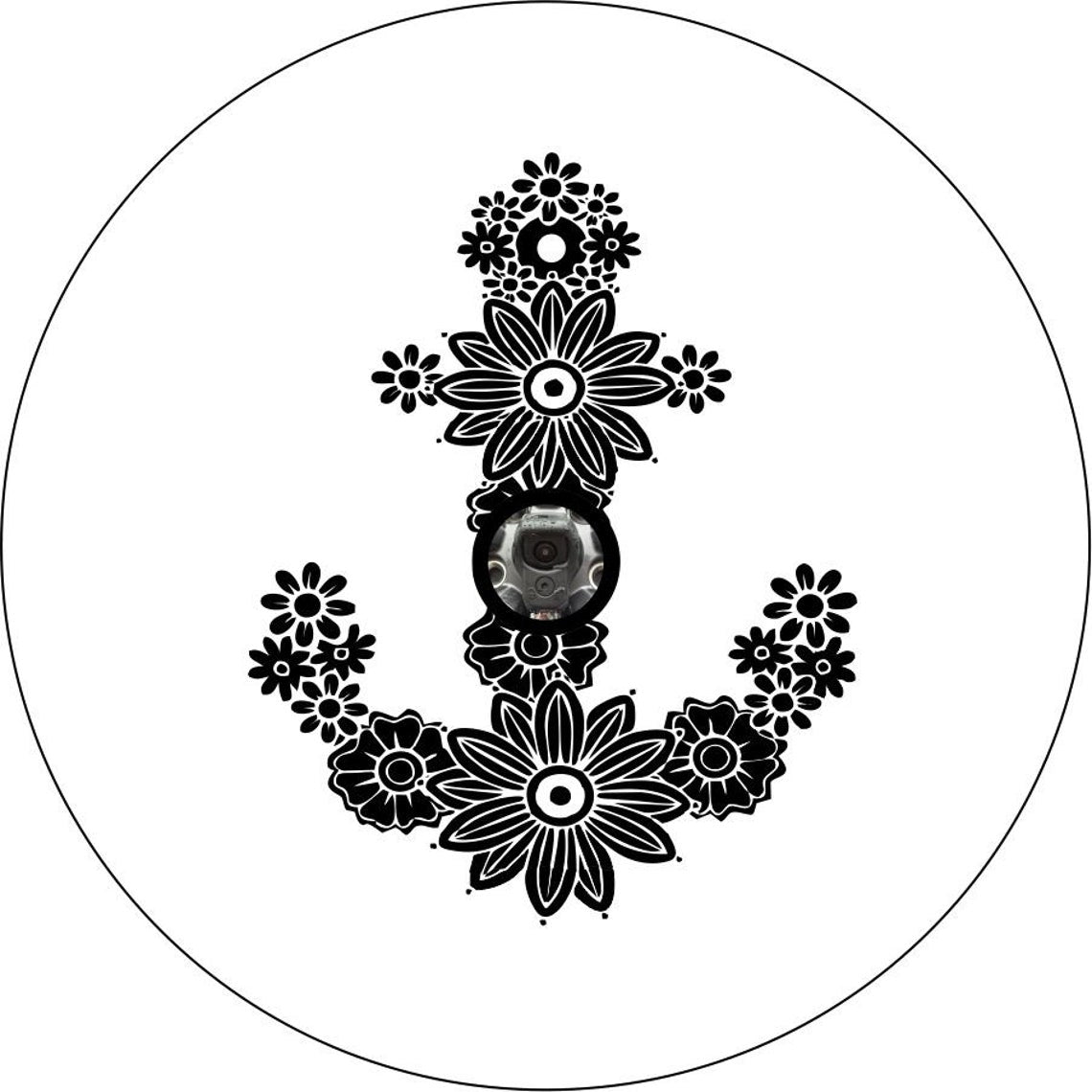 The shape of a boat anchor made from a variety of flowers and florals. This spare tire cover design is a high-quality custom-fit cover for any vehicle, make, model, and size - Jeep, RV, Travel Trailer, Camper, and more!