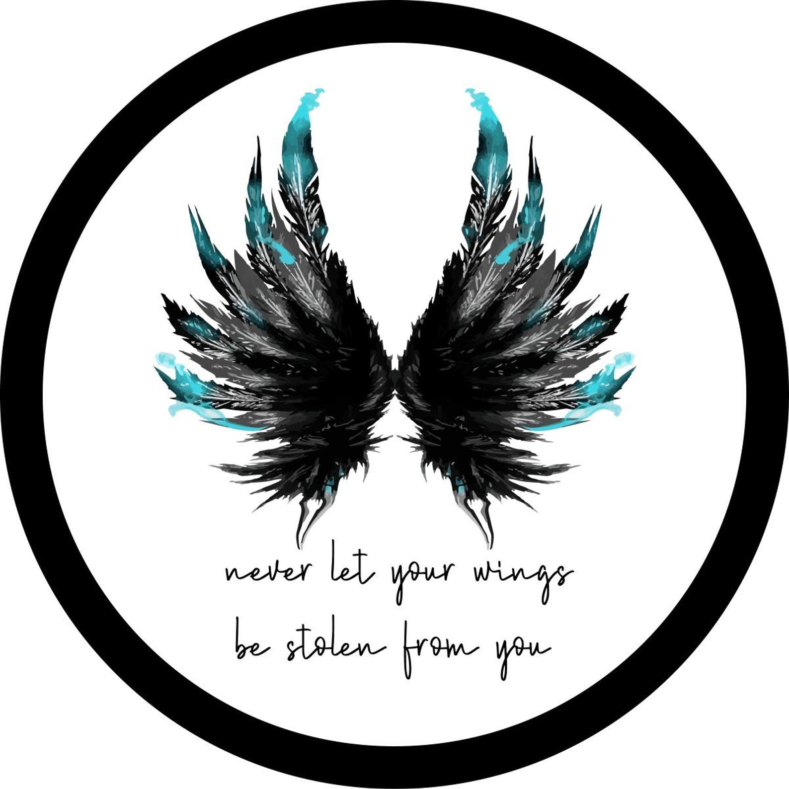 Angel wings in beautiful turquoise and black coloring with the sayings "never let your wings be stolen from you." This spare tire cover design is a high-quality custom-fit cover for any vehicle, make, model, and size - Jeep, RV, Travel Trailer, Camper, and more!
