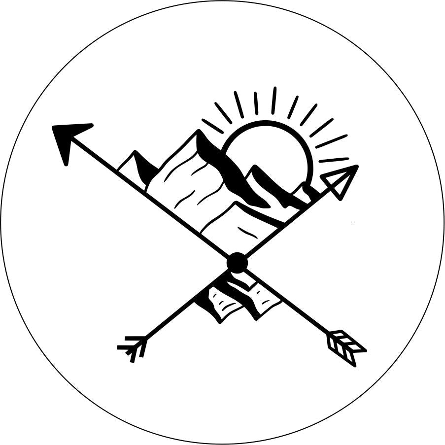 We love this creative design with two arrows crossing each other and a silhouette image of mountains with a sun rising or setting over them. There is also a small reflection of the mountains on the bottom of the arrows intersection. This spare tire cover design is a high-quality custom-fit cover for any vehicle, make, model, and size - Jeep, RV, Travel Trailer, Camper, and more!