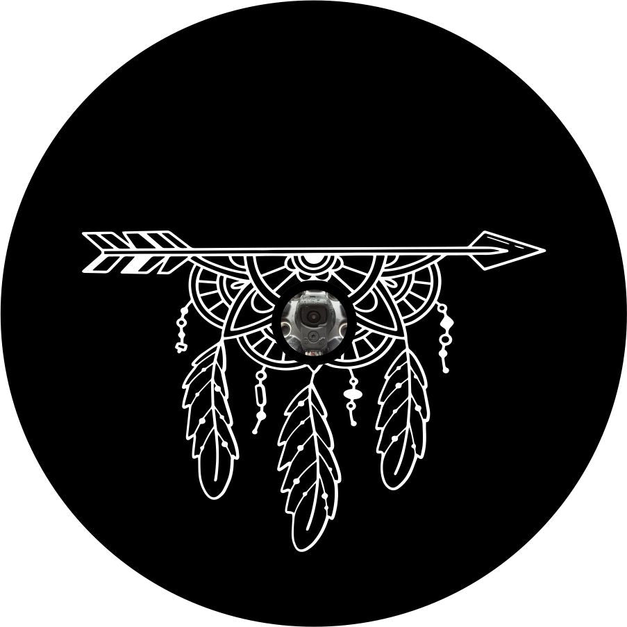 This design simply put is just pretty! Drive around with a beautiful creative boho mandala dreamcatcher-inspired design. This design has an arrow across the center with a half of a mandala and feathers and beads draping and hanging from the bottom of the mandala.
