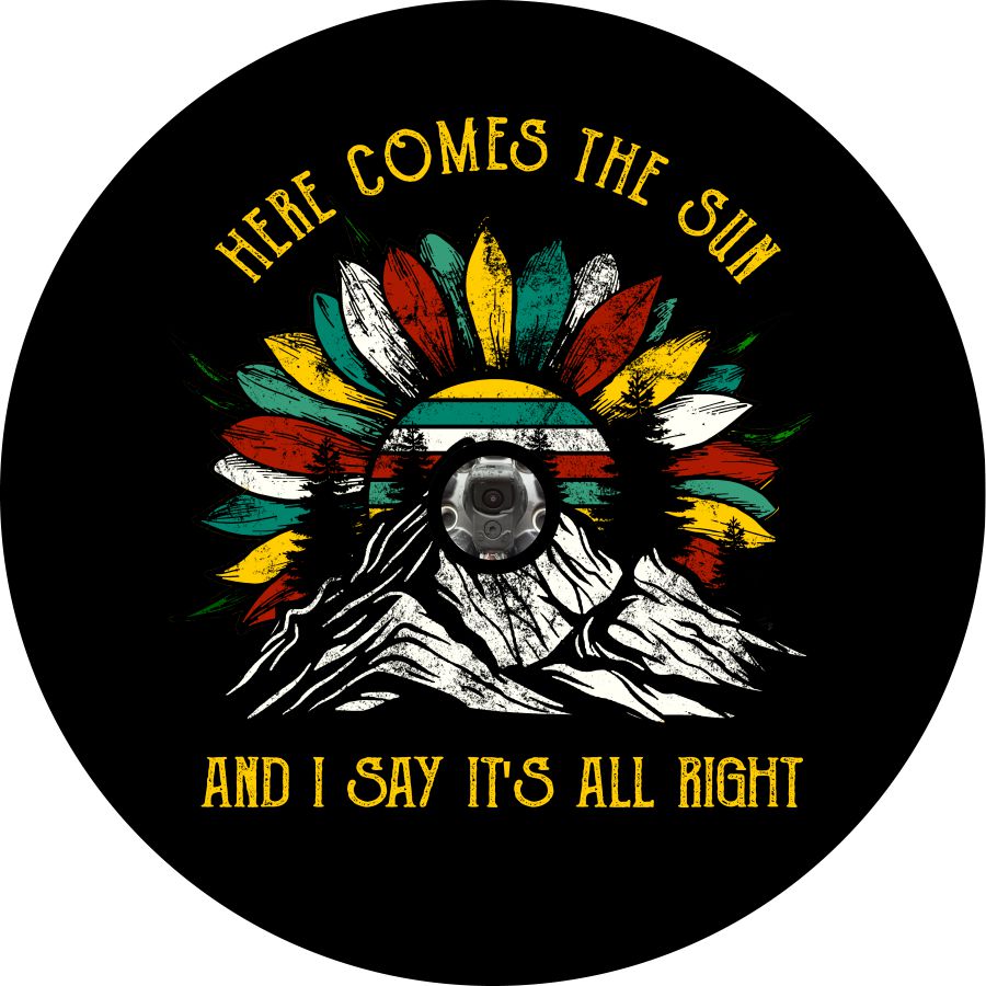 From the classic Beatles song, Here Comes The Sun, the song lyric, "Here Comes the Sun And I Say It's Alright" scripted around a beautiful image of a native colored sunflower design behind the mountains. This spare tire cover design is a high-quality custom-fit cover for any vehicle, make, model, and size - Jeep, RV, Travel Trailer, Camper, and more!
