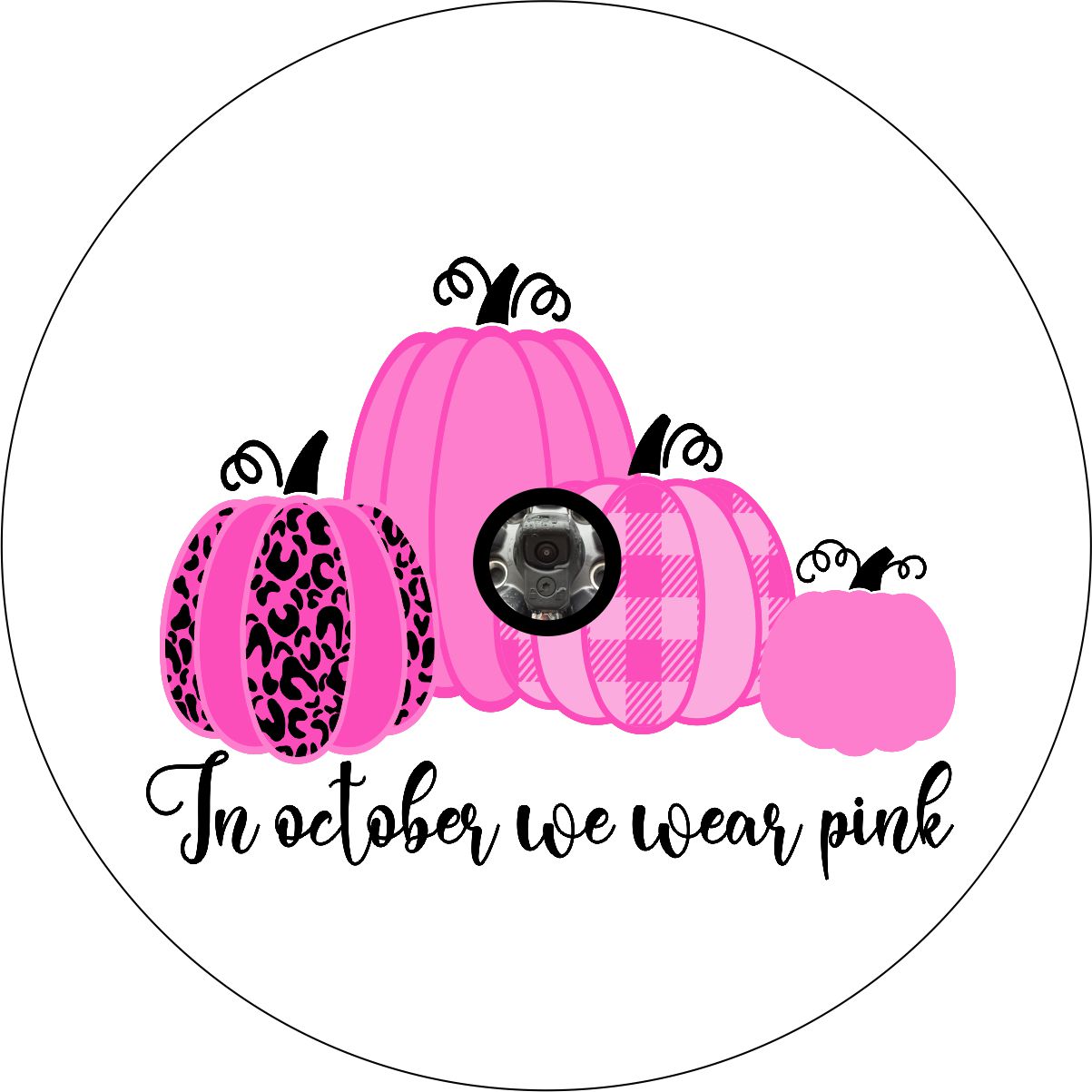 Pink pumpkins and the saying, "in October we wear pink" spare-tirecovers.com spare tire cover to show support for breast cancer awareness month.