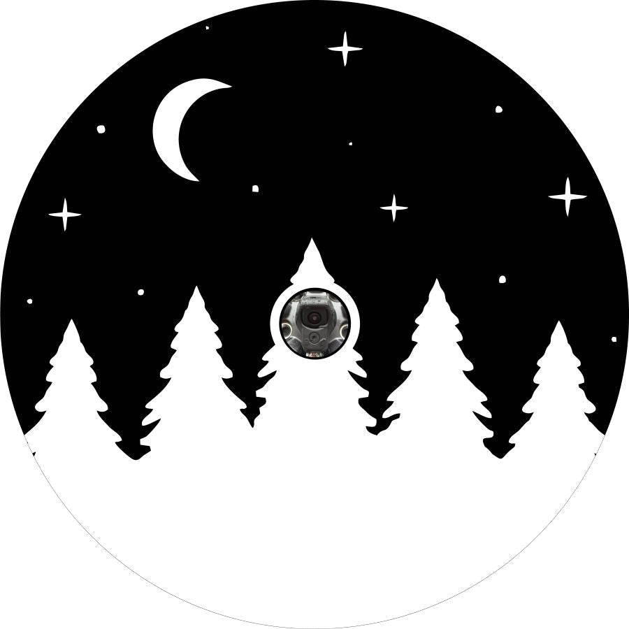 A forest silhouette of trees lining the night sky. This spare tire cover design is a high-quality custom-fit cover for any vehicle, make, model, and size - Jeep, RV, Travel Trailer, Camper, and more!