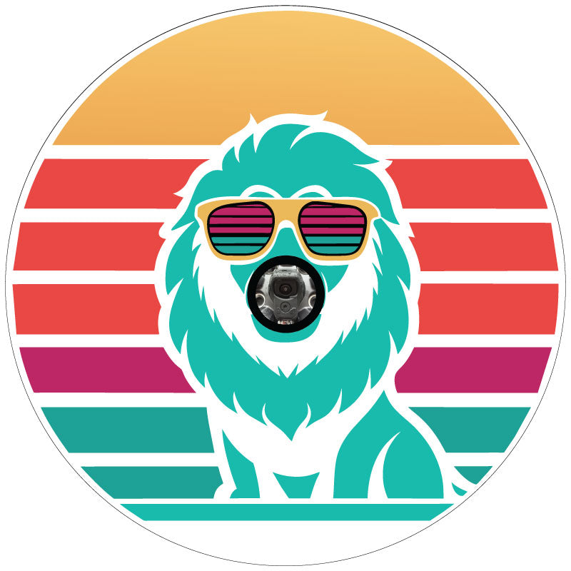 Retro striped design with a cool lion wearing sunglasses. Add some character to your spare tire with this cool spare tire cover design.