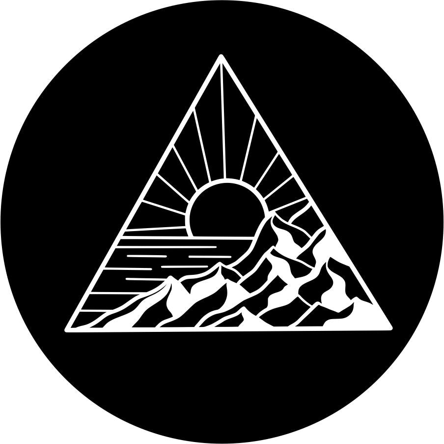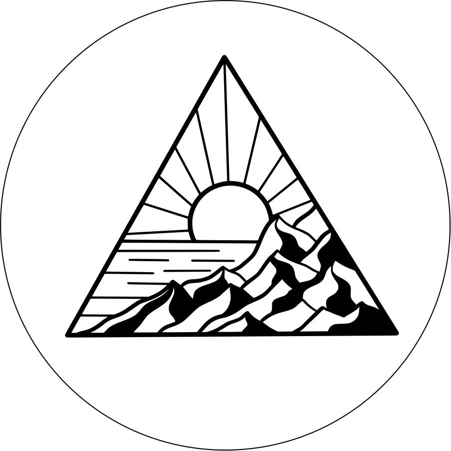 A creative take on a traditional sunset/sunrise illustration. Created inside the confines of a triangle shape are rocky mountains with the sun setting or rising on the horizon of the water.