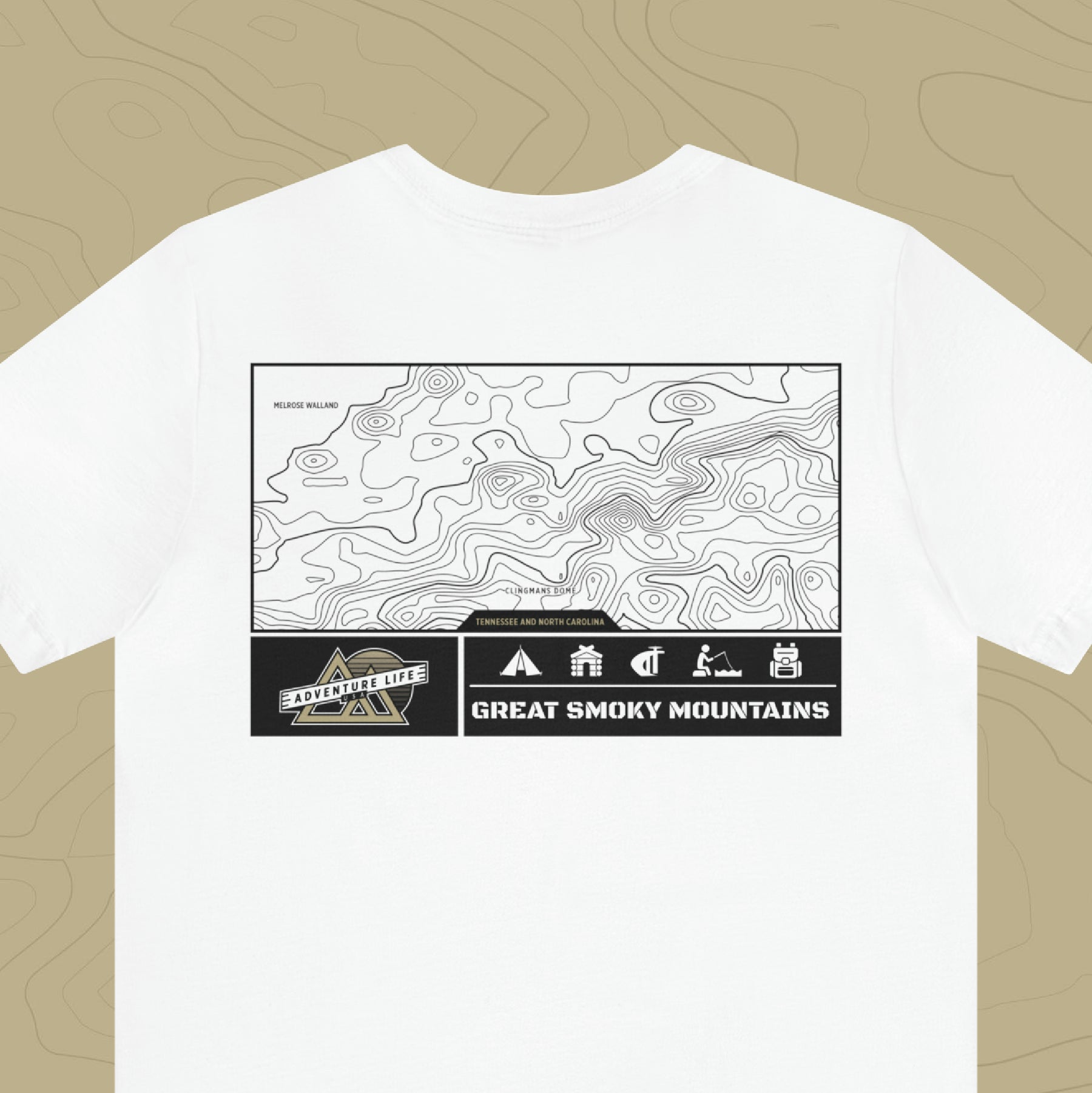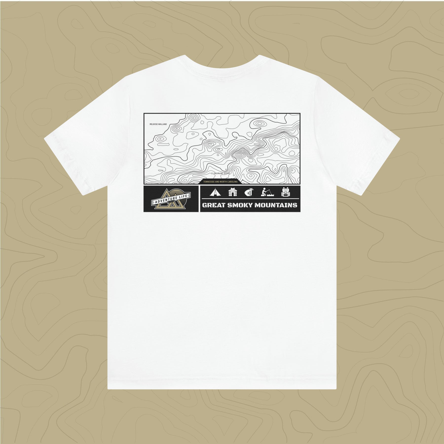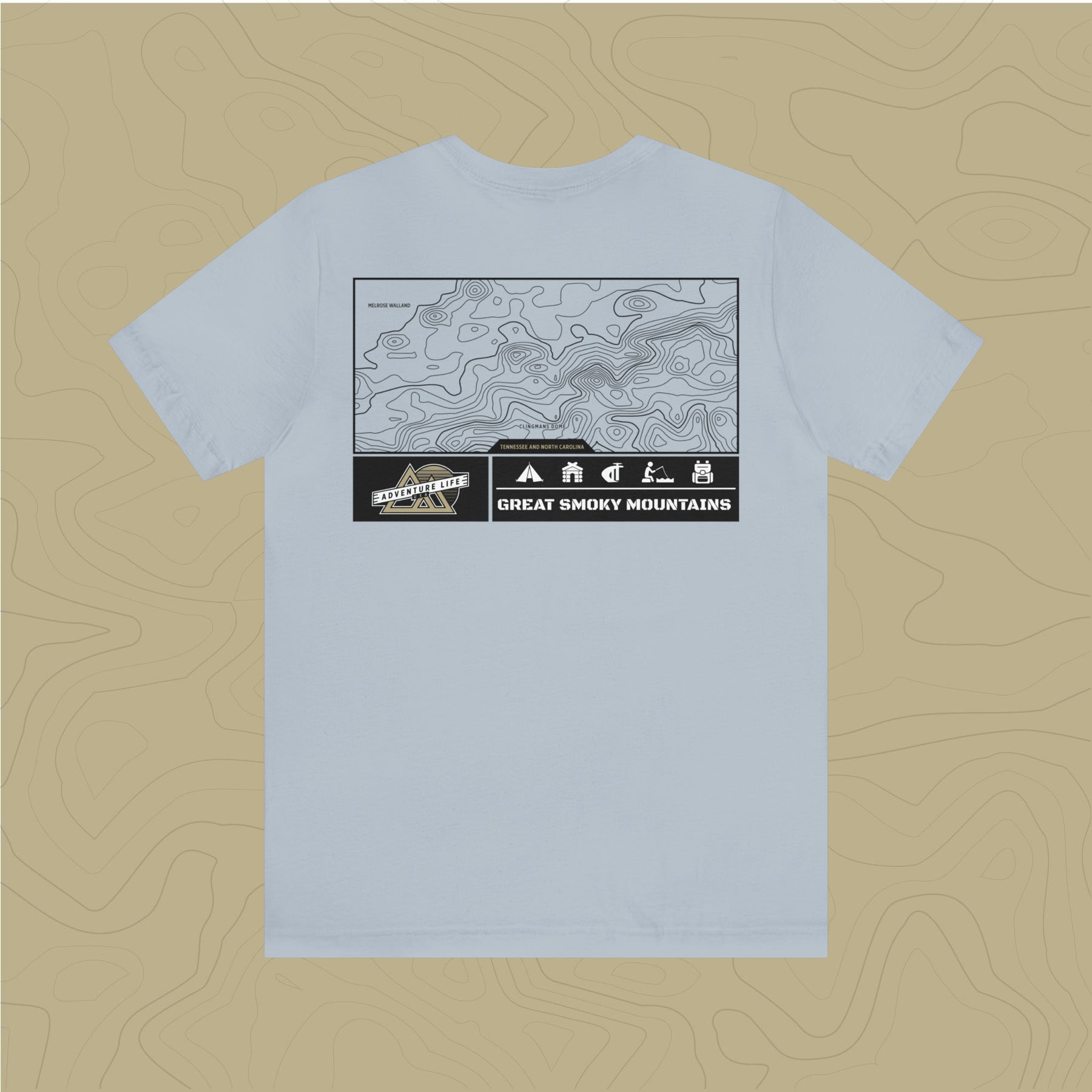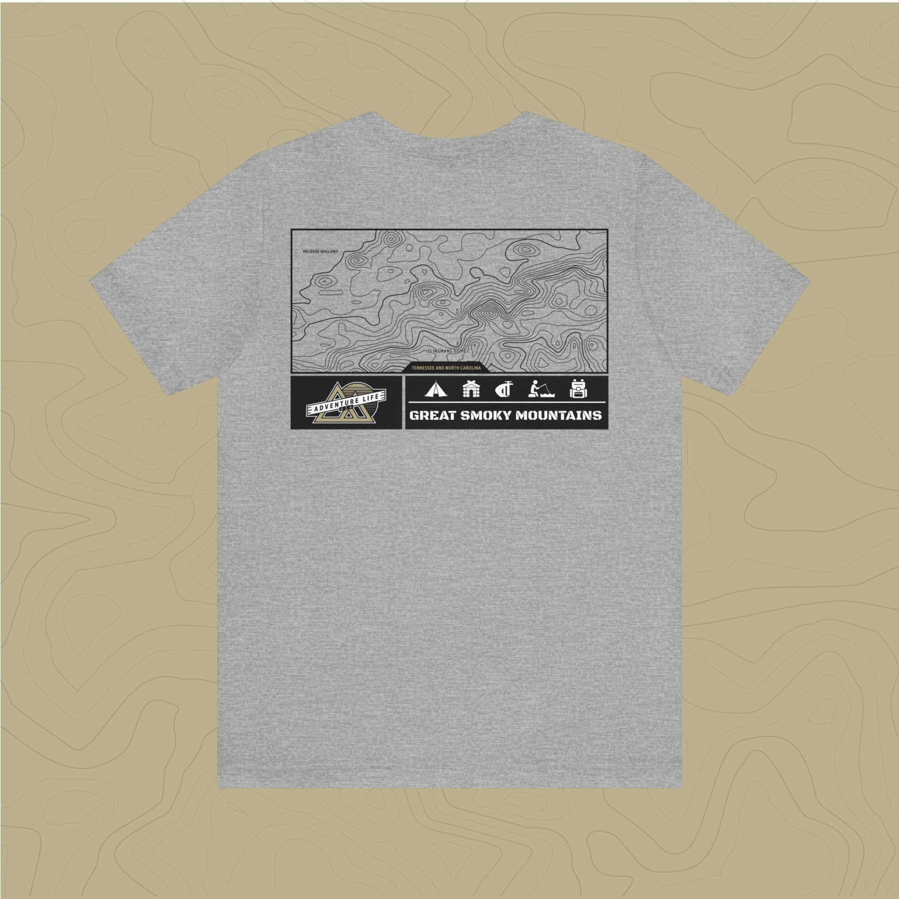 Embrace the adventure of Great Smoky Mountains National Park with our topographic map tee, a tribute to nature's beauty.