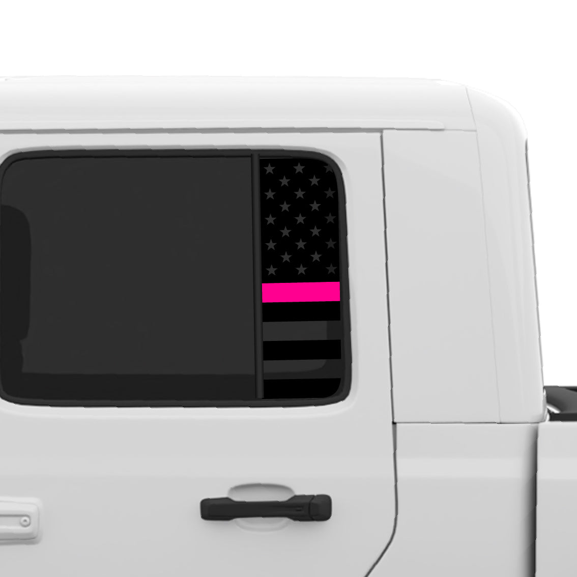 Elevate your Jeep's aesthetics and proudly display your support for various causes with our American Flag and Thin Line window decals. Crafted from premium optically clear window vinyl, these decals are designed for those who seek to express their love for the USA and stand in solidarity with different causes with style and pride. Whether you're a dedicated Gladiator owner or a Jeep enthusiast, these decals are the perfect addition to your vehicle.