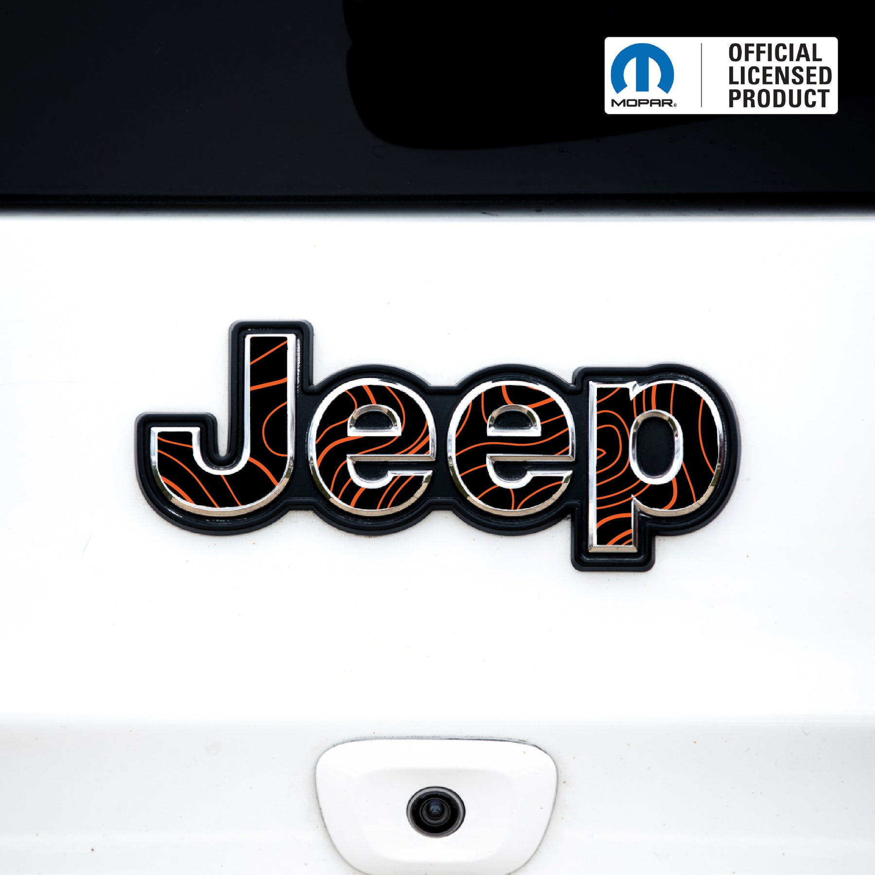 Customize your Jeep with an official Mopar licensed “Jeep” emblem overlay decal set. These are vinyl decal stickers designed to apply directly over your existing Jeep front grille and rear liftgate emblems — not replacement or 3D badges. Made from premium automotive vinyl, each overlay features a rugged topographic map print that adds subtle, adventure-inspired style while keeping a clean, factory-quality finish.