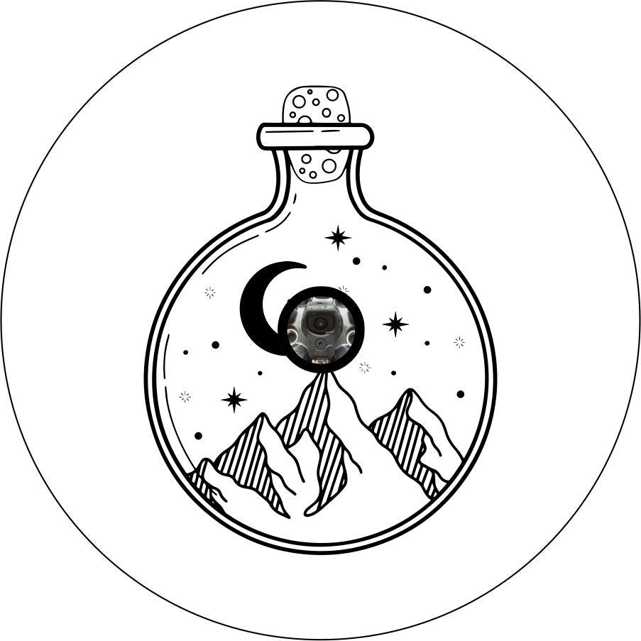 What a beautiful dream it would be to be able to bottle up the feeling we get when we are in the mountains under the night sky? Until such things exist, this design can depict our dream with the mountains and the night sky in a round corked bottle.