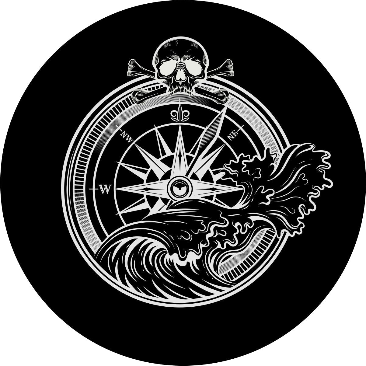 A nautical and pirate inspired spare tire cover with a compass and a wave. Skull and cross bones on the north end of the compass.