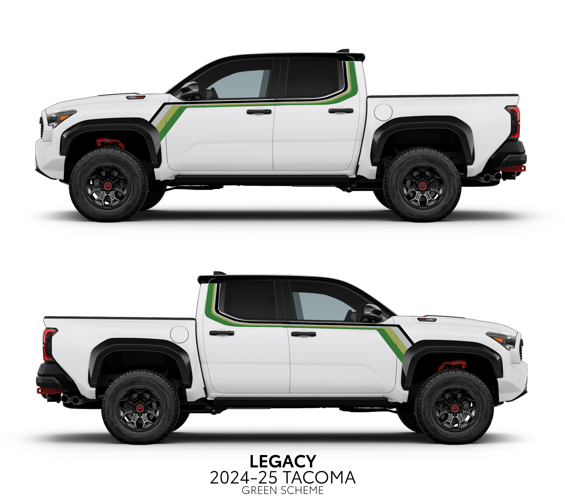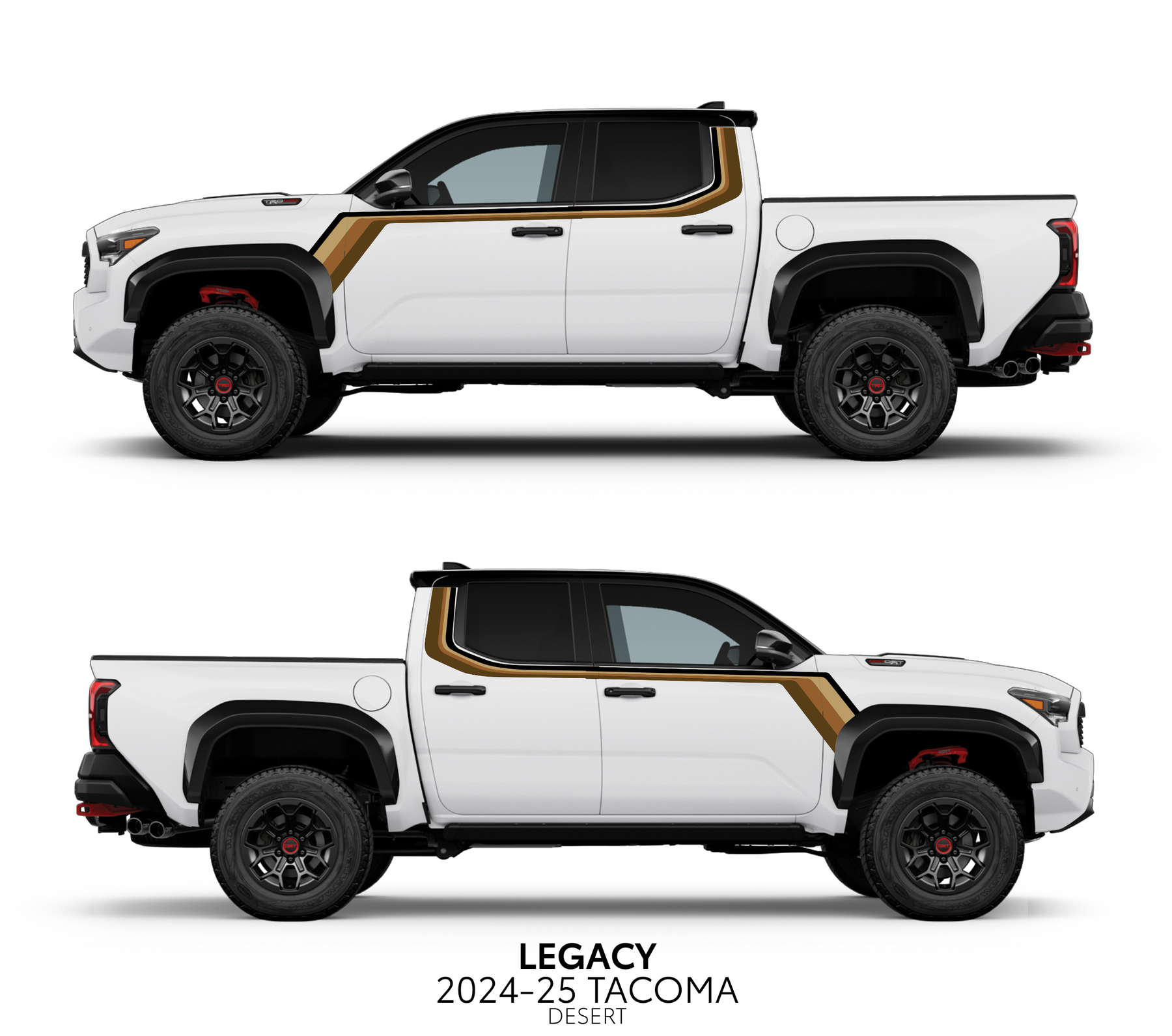 Discover the 2024+ Tacoma Legacy Decal Kit, complete with a full-body design. Experience hassle-free installation with our premium air release vinyl, guaranteeing a smooth and bubble-free application. Our kit provides a range of eye-catching color options and a stunning SATIN finish to make your car stand out on the road. Discover the perfect blend of style and convenience with our decal kit.