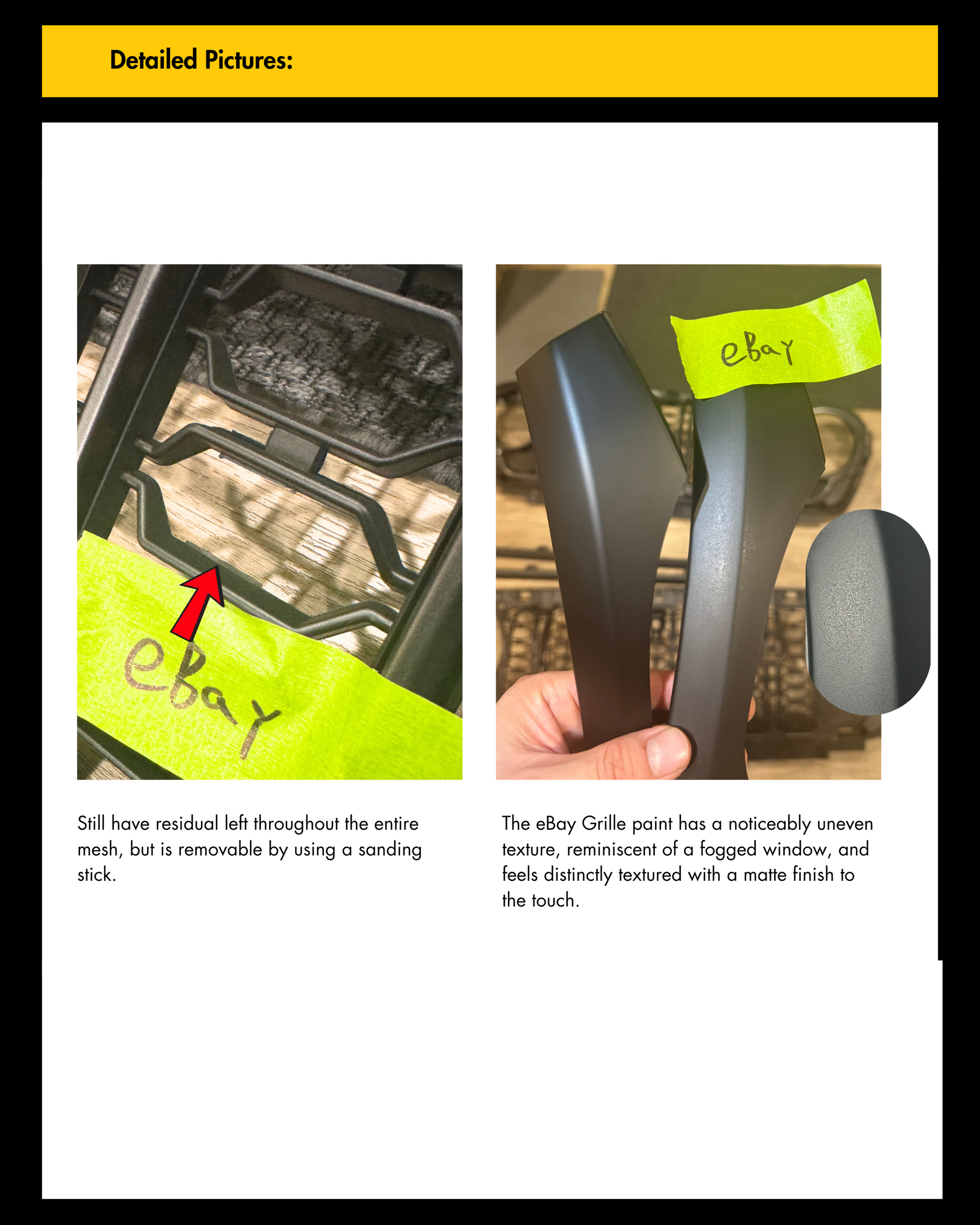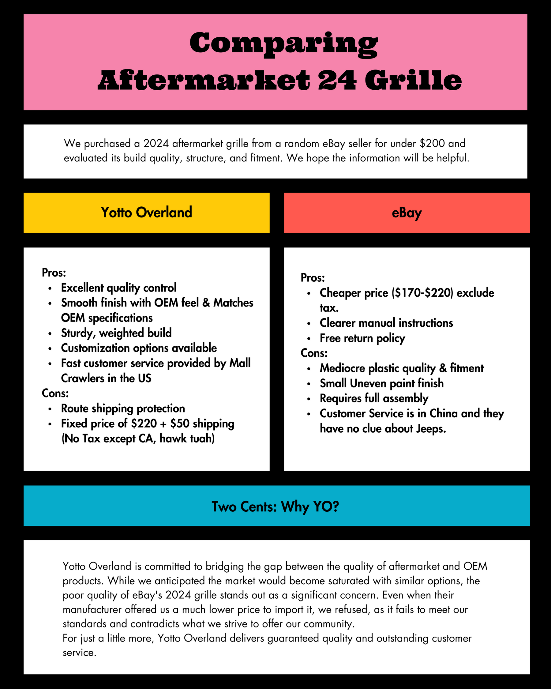 Yotto Overland exclusively produces 2024 grilles through its manufacturer to ensure top quality. Beware of eBay 24 Grilles, which cut corners on materials and specs, resulting in poor build quality and fitment issues.